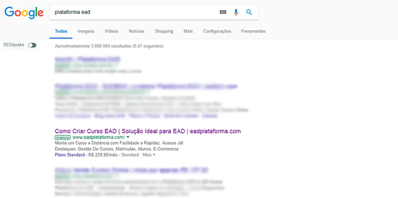 Então, investindo nessa palavra-chave, toda vez que alguém procura por plataforma EAD, o anúncio da nossa página é exibido.