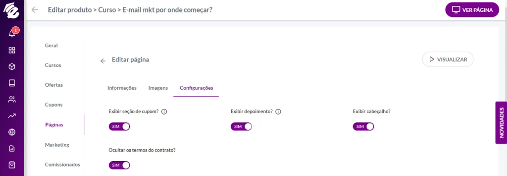 Menu > Produtos > Todos os Produtos > Clique no produto > Páginas > Configurações